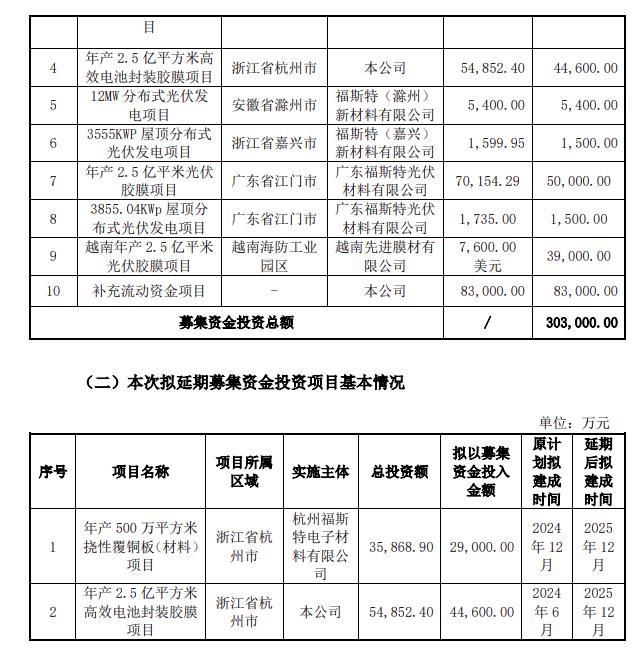 福斯特表示,鑒于2024年公司越南基地、杭州基地和蘇州基地將同步新增大量產(chǎn)能,為匹配下游光伏組件的實(shí)際需求,保障各個(gè)基地合理的產(chǎn)能利用率水平,避免造成新增產(chǎn)能閑置,因此公司計劃調整杭州基地募投項目“年產(chǎn)2.5億平方米高效電池封裝膠膜項目”的投產(chǎn)節奏,將剩余的產(chǎn)能延期至2025年底投產(chǎn)。