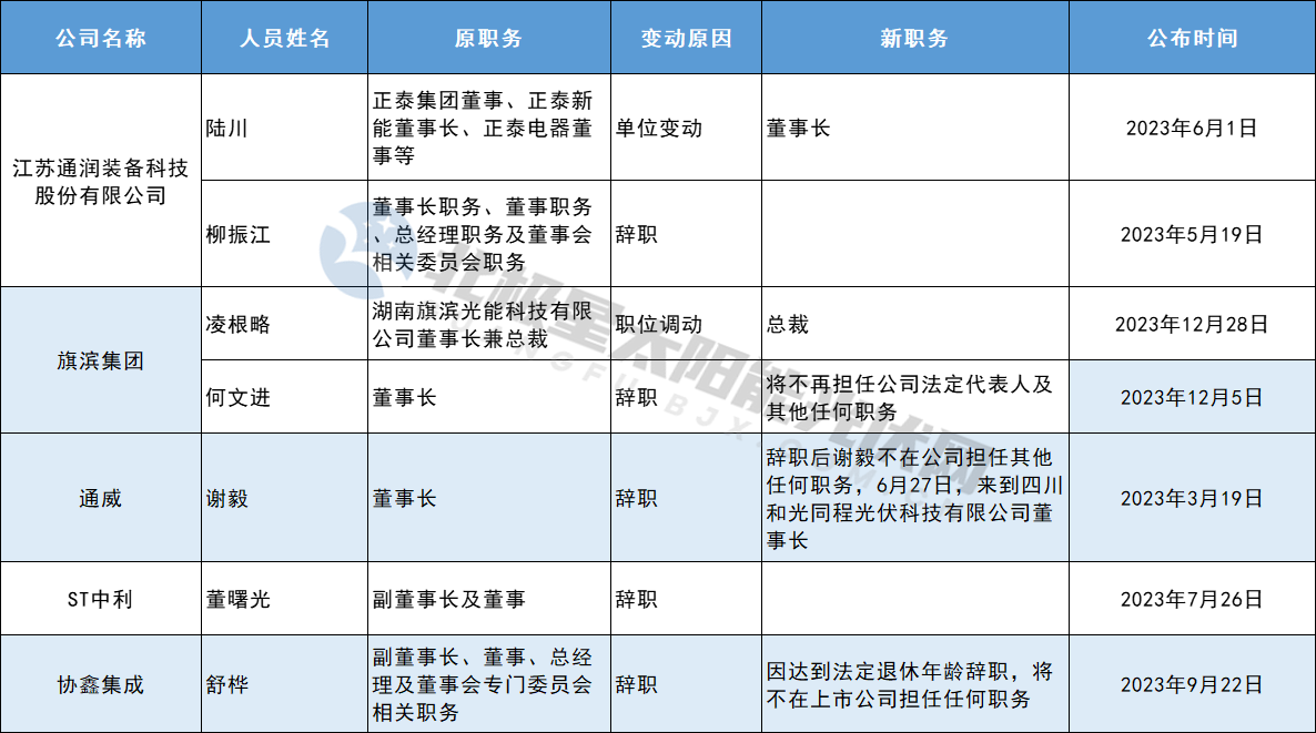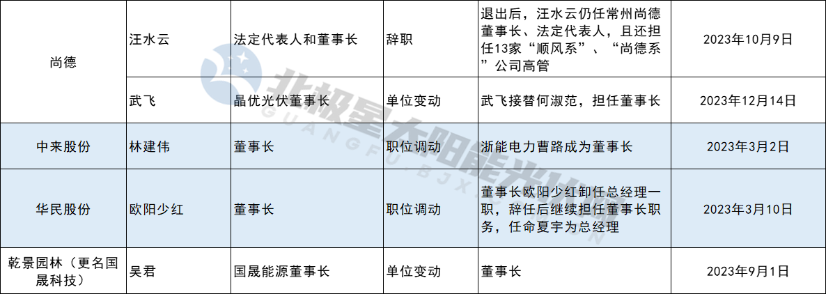 總裁/總經(jīng)理級別調整的企業(yè)有26家,包括正泰電器、旗濱集團、金剛光伏、大全能源、羅博特科、東方日升、金辰股份、愛(ài)康科技、安彩高科、福萊特、合盛硅業(yè)、棒杰股份、中綠電投資股份有限公司、協(xié)鑫能科、寶馨科技、易成新能、皇氏集團等。
