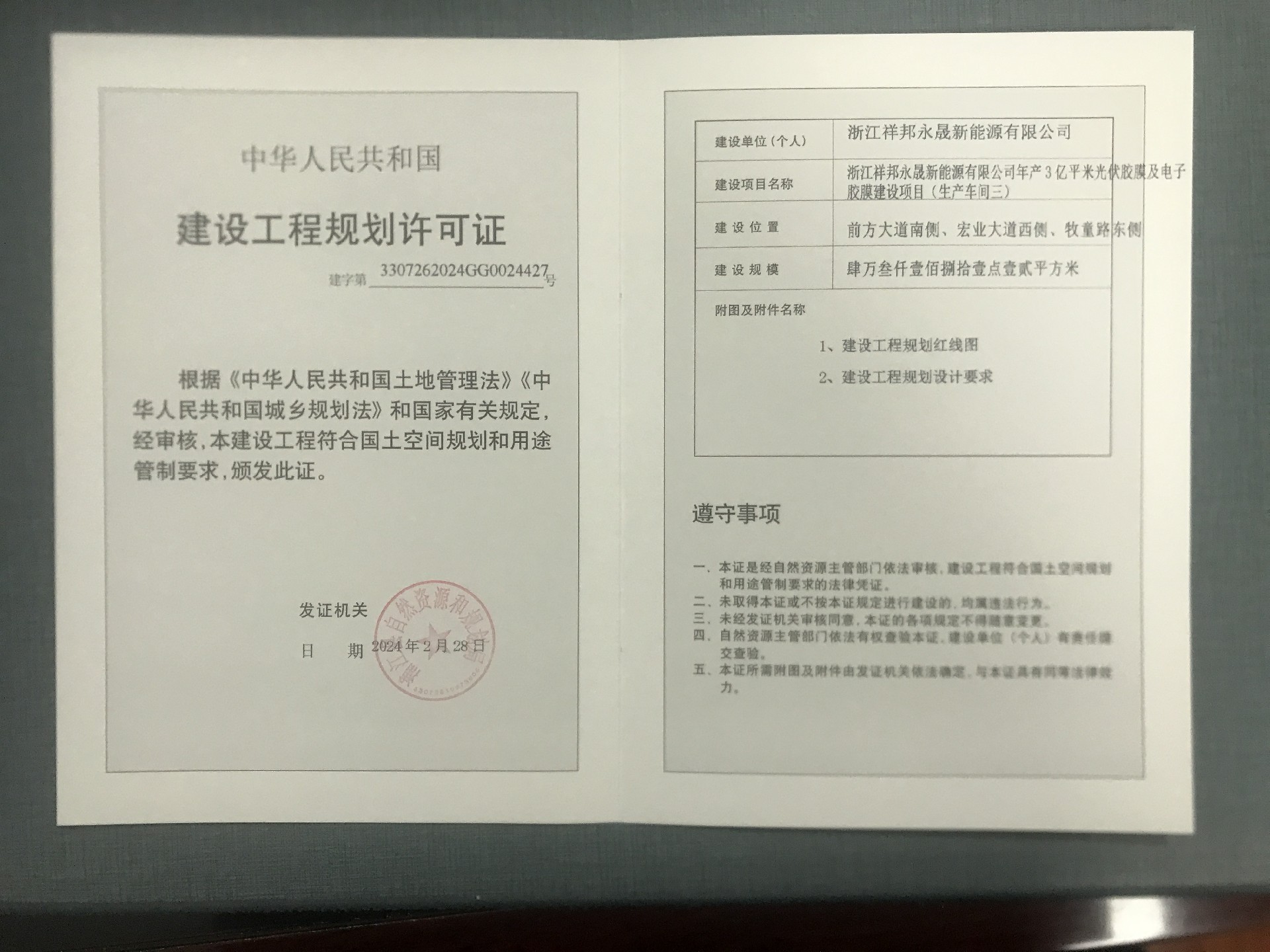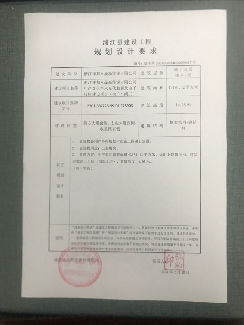 2月29日,浦江縣自然資源和規劃局發(fā)布《浙江祥邦永晟新能源有限公司年產(chǎn)3億平米光伏膠膜及電子膠膜建設項目建設工程規劃許可批后公布》。根據公示文件顯示,該項目建設單位為浙江祥邦永晟新能源有限公司,建設項目名稱(chēng)為浙江祥邦永晟新能源有限公司年產(chǎn)3億平米光伏膠膜及電了膠膜建設項目(生產(chǎn)車(chē)間三),建設規模43181.12平方米,許可日前為2024年2月28日。