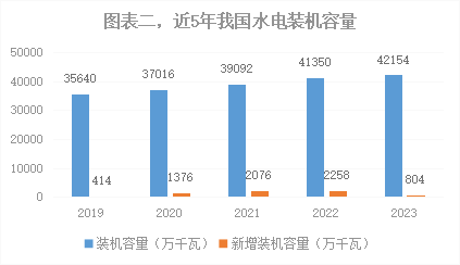 水電作為一種利用水流落差動(dòng)能來(lái)產(chǎn)生電能的可再生發(fā)電方式,既具有火電的穩定性又具有新能源的清潔性,對優(yōu)化我國能源結構、保障能源安全、減排溫室氣體、保護生態(tài)環(huán)境等方面具有重要推動(dòng)作用,是替代高碳能源的不二之選。長(cháng)期以來(lái),我國水電裝機規模一直處于穩步增長(cháng)態(tài)勢。截止2023年末,我國共有水電站8600余座,其中2200余座為大型水電站,總裝機規模達4.2154億千瓦(其中抽水蓄能5064萬(wàn)千瓦),占我國電力總裝機的14%,占技術(shù)可開(kāi)發(fā)裝機容量(預計為54,164萬(wàn)千瓦)的比例超過(guò)70%,表明我國水力資源利用率已達到比較的高水平。2023年水電裝機規模先后被光伏和風(fēng)電超越,排在第4位;總發(fā)電量達11408億千瓦,占我國總發(fā)電量的12.81%,僅低于煤電,排在第2位。2023年,共有203個(gè)水電相關(guān)的項目被列入年度重點(diǎn)省級項目行列,雅礱江牙根一級、金沙江昌波等大型水電項目核準開(kāi)工,全年新增水電并網(wǎng)容量804萬(wàn)千瓦,同比增長(cháng)-66%,其中常規水電259萬(wàn)千瓦,抽水蓄能545萬(wàn)千瓦。目前我國水電開(kāi)發(fā)綜合能力處于全球領(lǐng)先水平,具備了全球單機容量最大的百萬(wàn)千瓦水輪機組和700米級水頭、單機容量40萬(wàn)千瓦抽水蓄能機組的自主設計制造能力,在特高壩建設與防震抗震、大型地下洞室設計施工等領(lǐng)域創(chuàng )造諸多世界第一,成為我國能源電力“走出去”一張靚麗“名片”。