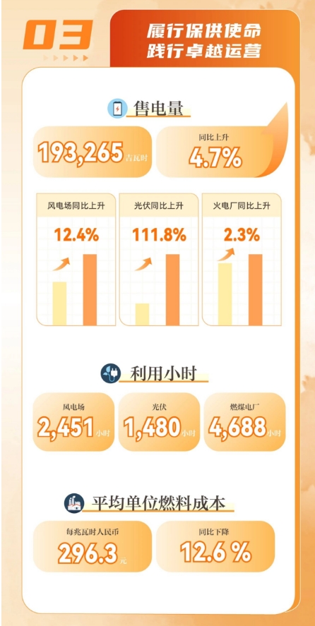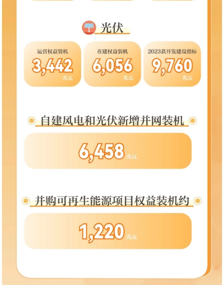 2023年新投產(chǎn)的風(fēng)電和光伏項目權益裝機容量分別為3106兆瓦和2230兆瓦。2023年,本集團自建風(fēng)電和光伏新增并網(wǎng)裝機6458兆瓦,并購可再生能源項目權益裝機約1220兆瓦,合計7678兆瓦。