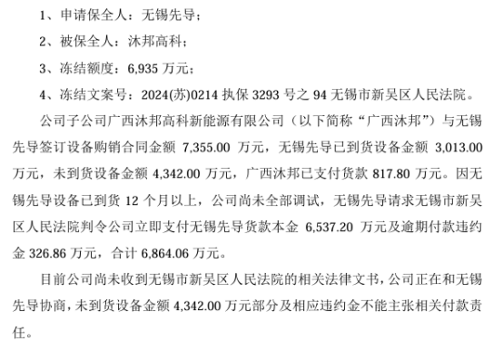 日前,沐邦高科披露的一則公告引發(fā)關(guān)注,其全資子公司廣西沐邦高科新能源有限公司(以下簡(jiǎn)稱(chēng)“廣西沐邦”)部分銀行賬戶(hù)被凍結110.8萬(wàn)元,原因是無(wú)錫江松科技股份有限公司(以下簡(jiǎn)稱(chēng)“無(wú)錫江松”)因其未如約支付電池設備款而申請了案件執行。