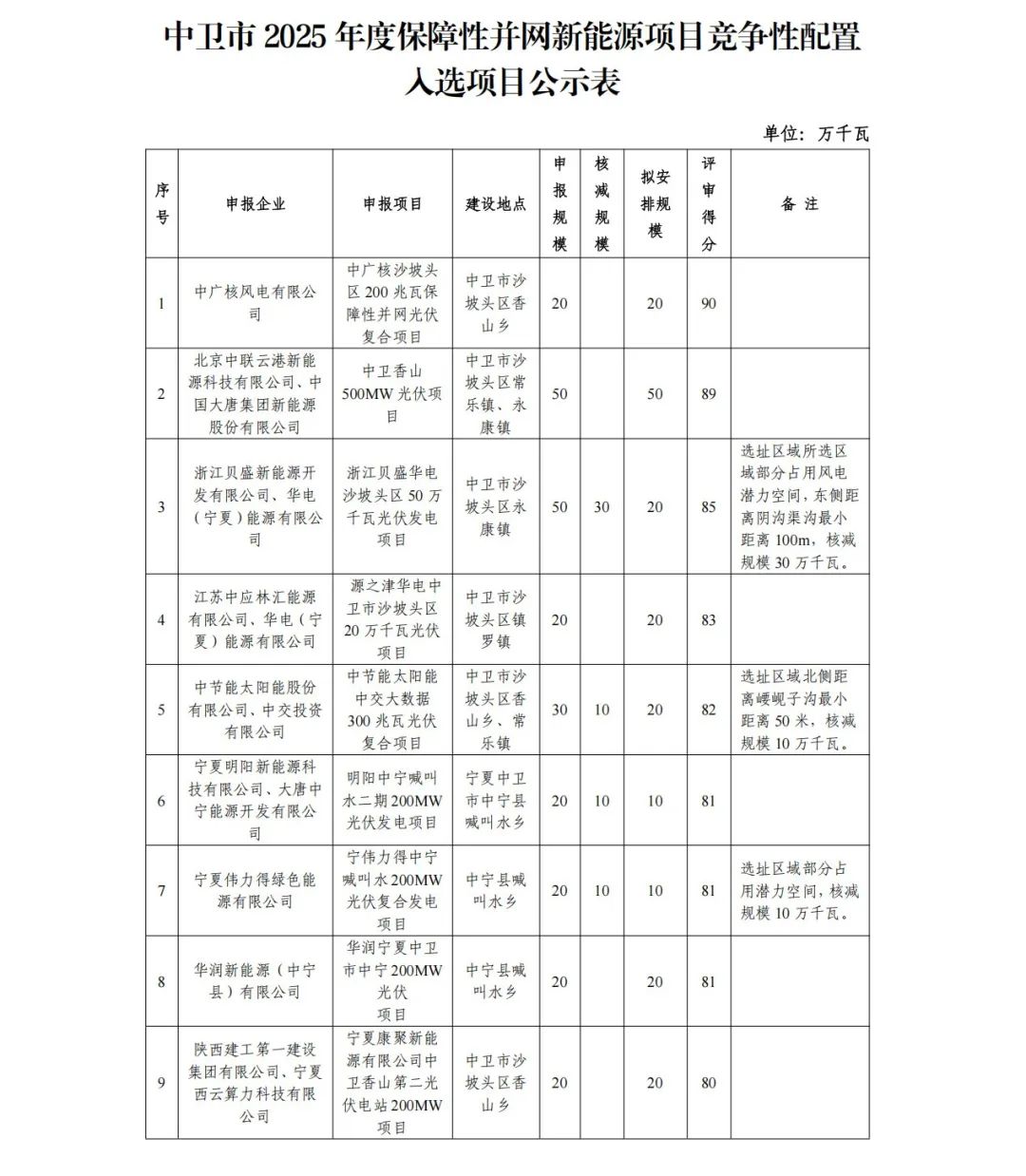 附件:中衛市2025年度保障性并網(wǎng)新能源項目競爭性配置入選項目公示表