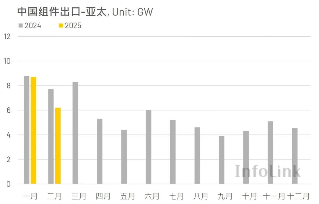 2025 年 1 月中國共出口其他亞太市場(chǎng)約 8.74 GW 的光伏組件,與 2024 年 1 月的 8.75 GW 相比差異不大;二月則出口約 6.23 GW 的光伏組件,與去年二月的 7.68 GW 相比下降 19%。截至今年二月底,中國一至二月共出口亞太市場(chǎng)約 14.97 GW 的光伏組件,同比去年 16.43 GW 下降 9%。