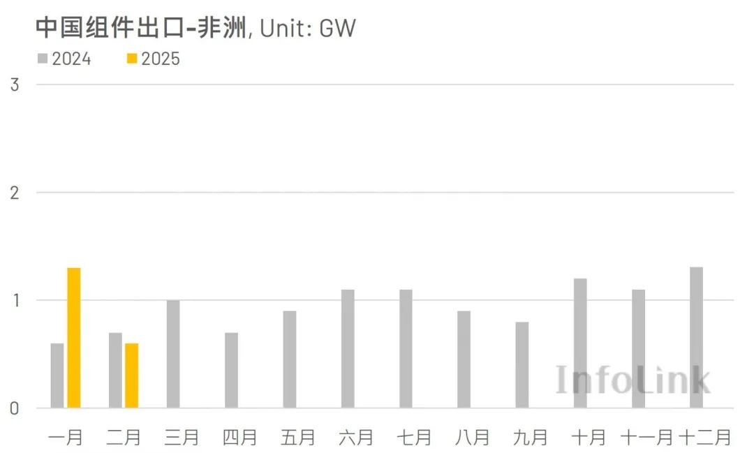 2025 年 1 月中國共出口非洲市場(chǎng)約 1.32 GW 的光伏組件,與 2024 年 1 月的 0.63 GW 相比上升 110%;二月則出口約 0.58 GW 的光伏組件,與去年二月的 0.69 GW 相比下降 16%。截至今年二月底,中國一至二月共出口非洲市場(chǎng)約 1.9 GW 的光伏組件,同比去年 1.32 GW 上升 44%。